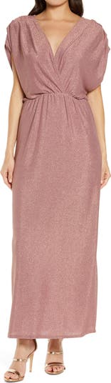 A shimmering metallic finish and draped surplice neckline bring contemporary glamour to an eye-catching maxi dress finished with an elasticized waist.