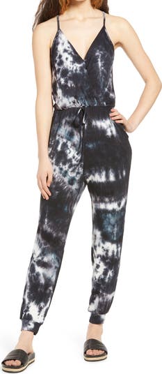 Tie-dye brings on-trend style to this comfy-casual jumpsuit designed with a drawstring at the waist and banded cuffs.