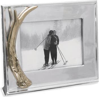 Makes a stunning statement. FRAME Antler 5 x 7 Horizontal with Gold Antler frame of polished metal enhances your favorite 5x7 horizontal photo with the addition of a naturalistic antler in a beautiful gold-tone finish. With its woodsy, western styling it looks brilliant when displayed on the mantle, desk, or shelf. The footed, self-standing frame makes a fine wedding gift.