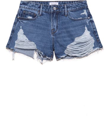 Laid-back with a hint of edge, these slouchy shorts feature faded nonstretch denim with a gap-free contoured waistband and fringey raw hems.