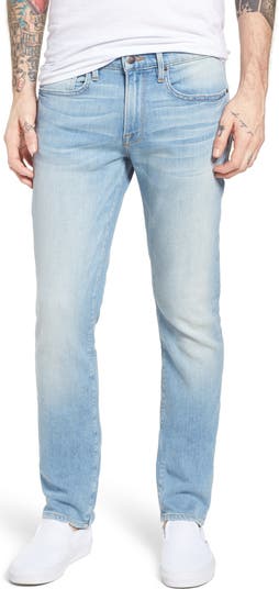 Lightweight stretch-denim jeans in a straight, tapered cut are faded and whiskered for a natural vintage feel.