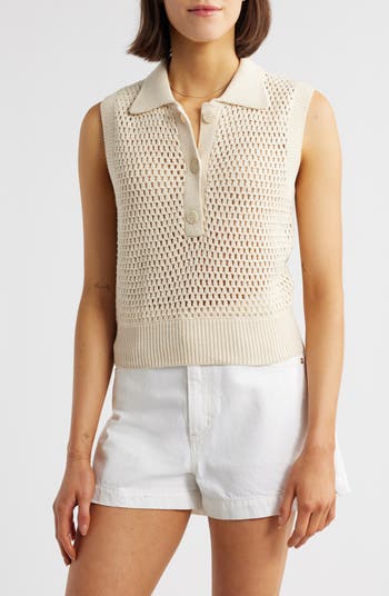 Soft cotton yarns bring plush texture to the openwork stitching of this cool sleeveless sweater with natty tennis-club polo styling.