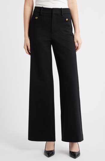 A high waist and button-patch pockets add tailored elements to stretch-enhanced pants balanced by flared wide legs for a retro aesthetic.