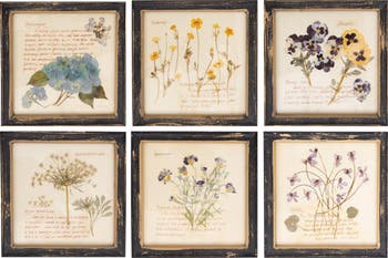 This square wood framed wall décor with floral images and information is a wall décor piece that features a square wood frame with a floral image and some facts or folklore about it. The wood frame has a black color and a textured surface. The frame has a heavily distressed finish that gives it a rustic and antique look. The paper has a printed design of a floral image and some information about it. The information includes the name and the species of the flower, as well as some old wives' tales or practical tips related to it. The floral images are colorful and realistic, creating a beautiful visual effect. The wall décor piece has an integrated hanging mechanism that allows it to be hung vertically. They can be hung together in a grouping or in different locations around the room to help tie the space together. It is perfect for decorating any living room, bedroom, kitchen, or hallway. Each wall décor piece measures 9.75 inches in length and 9.75 inches in height. These wall décor pieces are a fun and unique way to add a touch of nature to the home.