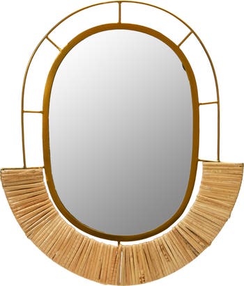 - Oval metal framed wall mirror in a gold finish with woven cane detail on one side; Can be hung vertically or horizontally