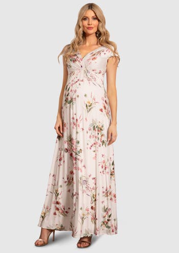 Shimmering French jersey fabric drapes effortlessly over your pregnancy curves, cascading away from the bust in swathes of silken fabric. The flattering crossover neckline extends out to the shoulders where they can be worn on or off to exude bygone glamour.