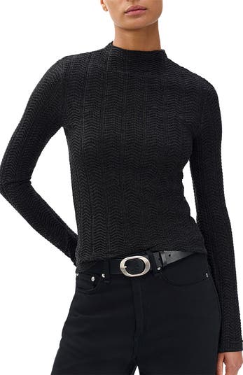 Stay warm in this soft merino wool sweater framed by a funnel neck and textured by wavy stitches for an ultracozy feel.