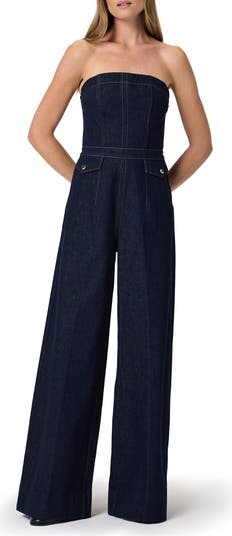 Show off your shoulders in this dark-wash denim jumpsuit made with pronounced topstitching and finished with leg-elongating wide hems.
