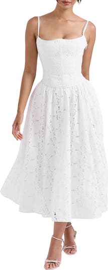 Dainty eyelet defines a winsome skirt cut from cool cotton.