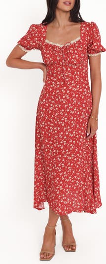 This floral midi dress features a sweetly nostalgic print, a shirred bodice and an A-line silhouette that flatters while allowing easy movement. Lace trim along the sweetheart neckline and short puff sleeves adds delicate detail, and an attached back tie lets you customize the fit to suit your shape.