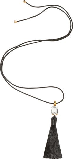 Dial up the drama of your ensembles with this adjustable-length necklace anchored with an emerald-cut Austrian crystal and silk tassel pendant that nods to art deco interiors.