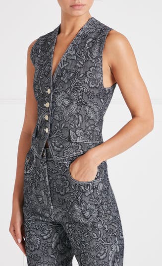 An elegant reworking of traditional tailoring, the Francis Denim Waistcoat is cut in jacquard denim featuring a rich floral motif. With a fitted waist, V-neckline, and gold-tone button front and cross over back, perfect layered over blouses or worn solo. Our Francis floral artwork is woven into denim using a washed jacquard technique. This unique design blends floral pattern contrasts with the rugged durability of denim, while the jacquard weave and soft wash lend a sophisticated, lived-in feel.