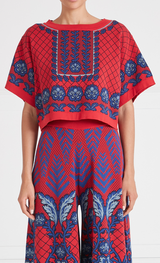 A vibrant reimagining from our archives, the Francis Grid Knit Top blends intricate jacquard-inspired motifs with delicate floral detailing to create a dynamic interplay of texture and geometry. The cropped, boxy silhouette and wide sleeves offer a relaxed yet contemporary shape, perfect for modern styling. Pair it with the coordinating trousers for a bold, head-turning ensemble, or style it with classic denim to let the pattern take centre stage.