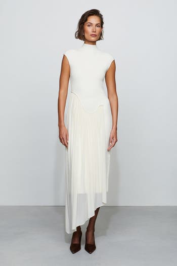 Sculpted midi dress in compact knit with a soft chiffon jersey drape. The curved piping and asymmetric hem do the work—flattering, easy, and ready for anything.