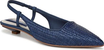 A slightly scalloped topline and pointy toe create a streamlined profile on a striking slingback pump set on a barely-there kitten heel for a hint of height.
