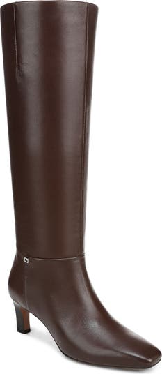 A slender square toe and modest heel bring poised balanced to a rich leather boot shaped in a knee-high profile and secured with a side zipper.