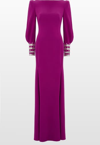 Defined by its voluminous sleeves and elegantly structured cuffs adorned with rows of embellishment, this gown blends minimalism with statement detailing. The clean silhouette is complemented by a softly flared hem, creating graceful movement with every step. Ideal for black tie occasions, awards nights or sophisticated receptions.