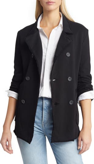 A timeless peacoat is updated with menswear-inspired notched lapels, oversized patch pockets and a cozy triple-fleece fabrication.
