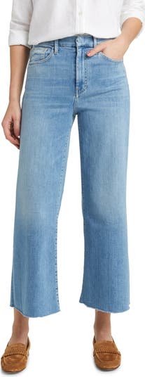 Widened legs and a sunbaked fade animate soft and stretchy Italian-dream denim jeans finished with raw-cut hems.