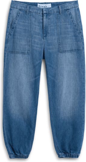 Tapered, ankle-cropped pants constructed from stretch denim feature a classic jogger silhouette and utilitarian-inspired pockets for modern-cool hybrid style.
