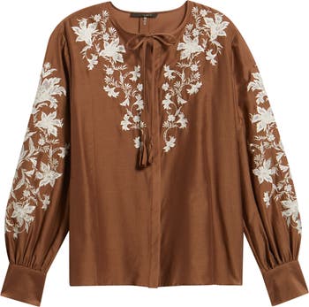 Cut from a luxe silk-enriched blend, this blousy peasant top is accented with a dainty neck tie and swirling floral embroidery.