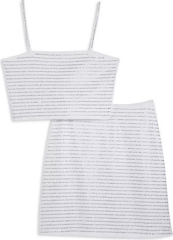 - Highwaisted comfortable skirt matches back to the top. Both zipper in the back. Rhinestones all over. Soft cotton fabric with stretch. Adjustable straps.