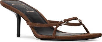 A superslim heel and square toe balance an eye-catching sandal designed with high-shine ring hardware and svelte straps.
