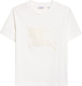 A crocheted Equestrian Knight Design—an archival motif crowdsourced from a public contest in 1901—brings tactile heritage to this lightweight cotton-jersey T-shirt.