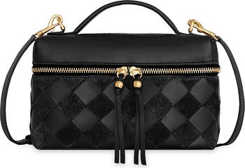 Interwoven panels of supple suede and smooth leather create textural interplay on a structured train case perfect for stylishly storing your essential cosmetics while on the go. An optional crossbody strap provides hands-free carry.