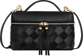 Interwoven panels of supple suede and smooth leather create textural interplay on a structured train case perfect for stylishly storing your essential cosmetics while on the go. An optional crossbody strap provides hands-free carry.