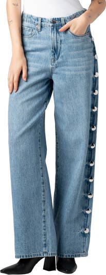 Glossy studs race down the sides of these barrel-leg jeans cut with a high waist from nonstretch denim.