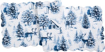 Try a fresh new holiday palette with the Frasier tabletop collection. Featuring a forest scene of a snow-covered cabin and winter wildlife in hues of Victorian blue, Frasier makes it easy to decorate for the winter season. Reverse to a blue serene alpine forest suited for a ski lodge getaway.