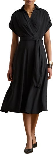 Serve elegance with a side of carefree flair in this faux-wrap shirtdress featuring a smart collar, a self-tie belt and short sleeves with roll-tab cuffs.