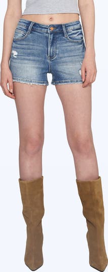 Threadbare rips and frayed hems lend lots of history to stretch-denim shorts cut with a supershort inseam.