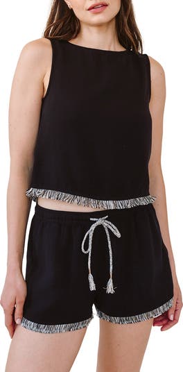 A frayed hem brings subtle texture to this cropped tank cut with a gently curved back and framed by a polished jewel neckline.
