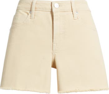 Frayed hems add to the vintage vibe of stretch-kissed denim shorts designed with a high-rise waist, classic pockets and an edgy summertime look.
