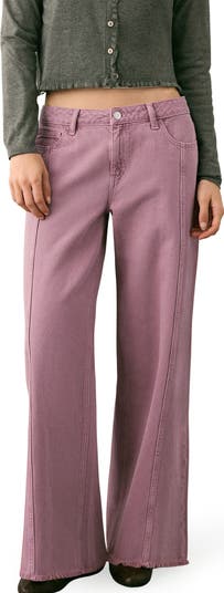Bring a fresh look to denim day with muted-pink jeans featuring a low-rise waist, frayed wide legs and seam details that visually elongate your silhouette.