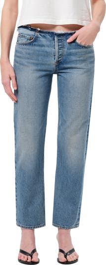 An edgy cutoff waistband creates a low-rise fit in these slim-cut, ankle-length jeans made from vintage-vibe nonstretch denim.