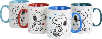 What better way to add some lighthearted fun to your morning coffee than to start your day off with your favorite Peanuts pal Snoopy! This Freckled Joy 4 piece mug set offers you four different Snoopy character designed mugs featuring different colors with a fun speckled exterior. Constructed with durable stoneware that is dishwasher and microwave safe for easy clean up and fast re-heat. These mugs will soon become your go to!