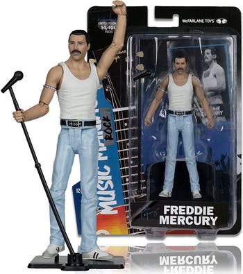 Freddie Mercury figure based on his look from the Live Aid 1985 performance. Incredibly detailed 6 scale figure featuring FREDDIE MERCURY likeness. Designed with up to 12 points of articulation for posing and play. Freddie Mercury accessories include mic and mic stand. Includes art card with numbered certificate of authenticity. Showcased in Music Maniacs themed window box packaging.