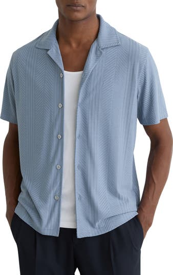Tonal, multidirectional stripes bring subtle texture to a stretch-kissed camp shirt making it a getaway essential that'll see you stylishly from the pool deck to dinner at the resort.