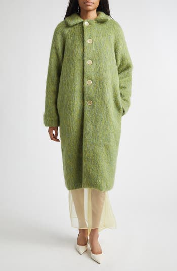 Virgin wool, alpaca and mohair combine to great effect on this fuzzy mélange coat cut with raglan sleeves for a soft vintage aesthetic.