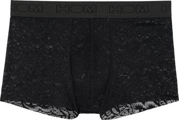 The HOM Free Cut Lace Trunk sits low on the waist and has a sheer body and pouch with a paisley lace pattern. These trunks contain a center back seam for a body-defining fit. These trunks are flyless and have a wide elastic waistband with repeating jacquard-knit HOM logo.