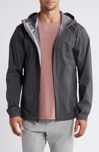 A hooded rain jacket cut from breathable matte fabric is durable and reliable with a waterproof finish, taped seams and tricot backing for second-skin comfort.