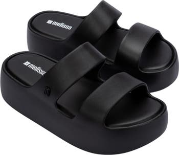 A water-resistant finish and the brand's infused fruit scent add a signature flourish to a minimalist slide sandal lifted by a chunky platform.
