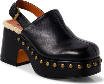 Rounded studs punctuate the platform sole of a striking leather clog set on a chunky heel and lined with plush genuine shearling for comfort.