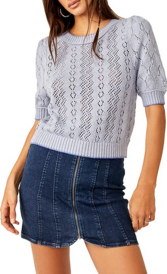 Airy open stitching charms this day-to-night sweater framed by puff shoulders and elbow-length sleeves.