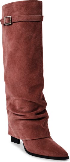 A slouchy, fold-over shaft enhances the modern allure of a knee-high boot styled with a pointy toe and tapered block heel.