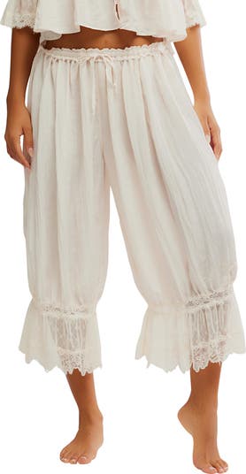 Dreamy and delicate, these crop pajama pants bring a vintage-inspired vibe with their airy silhouette, gathered waist and lace-trimmed ruffled hems.