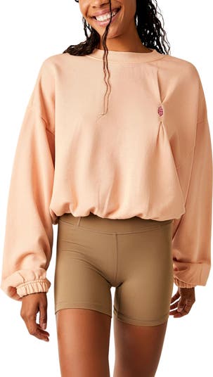 Voluminous dropped-shoulder sleeves coordinate with the elasticized hem on the cute and comfy bubble silhouette of this all-cotton sweatshirt.